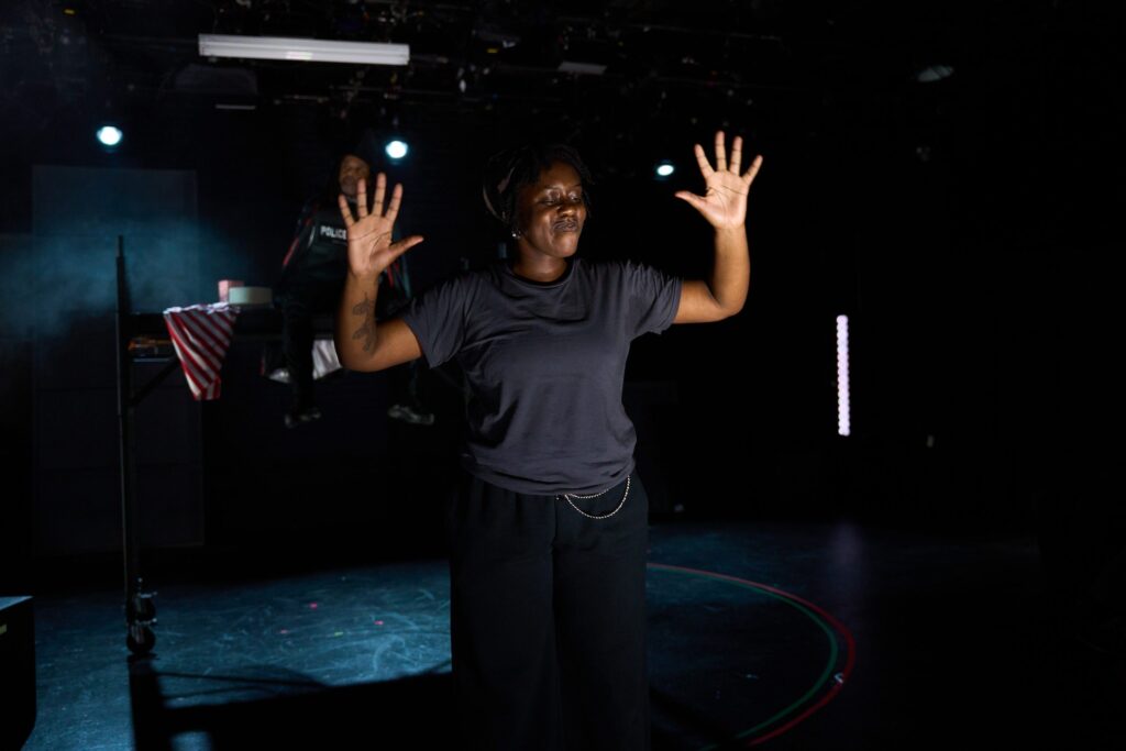 Then it was HERE’s production of Off the Record: Acts of Restorative Justice (RECOMMENDED), James Scruggs’ immersive and interactive diatribe against the U.S. criminal justice system. Although not nearly as elaborate as his menacingly carnivalesque production of 3/Fifths nine years ago (which I had the privilege of experiencing), Scruggs’ latest is no less confrontational as it investigates what it means to be person of color in this country as it relates to justice and civil rights. Co-written by lawyer and criminal justice advocate Thomas Giovanni, the production unfolds as a series of increasingly pointed questions posed to the audience — some more directly than others — regarding whether our country’s criminal justice system is irrevocably broken, and if so, whether the only alternative is to burn it all down and start anew from the ashes of its demise. Part lecture, part interactive game, the audience plays a key role in how it all shakes out, although I have a strong suspicion that each performance arrives at the same pessimistic and downbeat conclusion, especially when supported throughout the evening by examples of blatant inequities and overwhelming statistical evidence. As Michael Rohd and Annalisa Dias’s provocative, experiential production unfolds through an array of stylistically divergent sub-presentations led/moderated by members of the company — augmented by some encompassing lighting and video design work — there are definite shades of the biting satire of plays like George C. Wolf’s The Colored Museum, as well as the ritualistic community-building of Alesha Harris’s What to Send Up When It Goes Down. If it all doesn’t quite amount to the guttural sucker punch its creators intended, I nevertheless applaud the endeavor’s attempt to uncompromisingly interrogate — no matter how uncomfortably — a faulty system.
