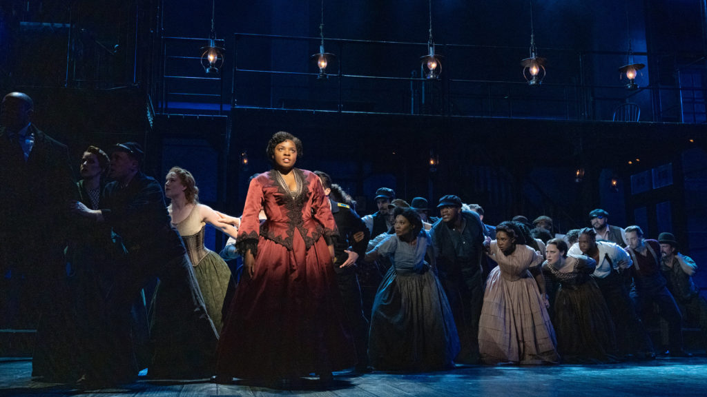 The production has been directed by Moisés Kaufman, whose somber but bombastic staging seems inspired by Les Miz. Taking its cue from both Irish and African folk dancing, Mr. Jones’s choreography is exceptional, stylishly foreshadowing the advent of tap dancing, as well as driving the show forward with excitement and drama (the second act dance-off is especially thrillingly conceived and executed). Of the performances, Joaquina Kalukango and Chilina Kennedy – who play Five Points’ focal Black and Irish American matriarchs, respectively – steal the show with their fierce commitment. Ms. Kalukango is especially powerful, giving a raw performance that grounds the musical, giving it real stakes (her 11 o’clock number is sure to be one of the highlights of the season). Beyond these two performances, thecast is top notch, and there’s a real sense of community among them that dovetails beautifully with the show’s portrayal of the resiliency of Five Points under duress.