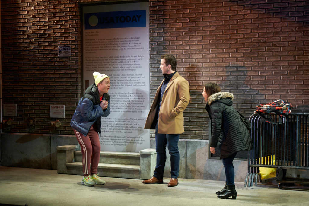 Earlier this week at the Newman Mills Theater, Ana Nogueira’s entertaining new comedy Which Way to the Stage opened Off-Broadway courtesy of MCC Theater. The play is an unabashed love letter to musical theater and the art form’s obsessive and opinionated fans. In the play, these fans are manifested by two “BFFs” – Judy, a cis straight woman, and Jeff, a flamboyant gay man who more than dabbles in drag – who spend a substantial amount of their time (when they’re not auditioning for heavily sought-after acting gigs or hanging out at gay bars) at the stage-door of a Broadway theater trying to get the elusive Idina Menzel’s autograph. Then comes along Mark, a conventionally handsome, seemingly straight-acting white man, who stirs up drama when he inserts himself into their lives.
