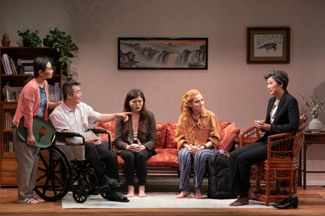 The production has been directed by May Adrales, who does well to jump seamlessly back and forth between 2006 and 2016, the play’s two temporal points of reference. Golden Shield is a long, meaty play, and Ms. Adrales does well to bring pep and a snappy pace to her staging (as she did with her production of Vietgone, which was also presented by MTC). The cast is very good for the most part, although some of the courtroom and business scenes don’t register quite believably due to the earnestness of some of the acting. Coming off most affectingly as Eva is Ruibo Qian, whose soulful performance forms the production’s bruised, aching heart.