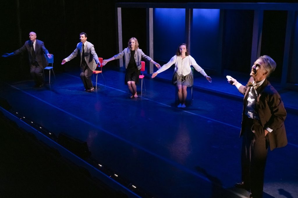 The production has been meticulously restaged with only minimal alterations and updates (smart phones are now mentioned) by SITI’s longtime co-artistic director Ann Bogart. The Medium features the company’s distinctive blend of movement and speech, and its rigorous repetitions gradually cast a spell over the audience. The cast of five perform the piece with impressive physicality and discipline, especially the tireless Will Bond who plays McLuhan as a quirky but irrepressible ringleader. It was especially poignant to see Ellen Lauren and Mr. Bond – two founding members of SITI Company – in action. Both still perform with the kind of precision and boundless energy that put the company on the map in the first place.
