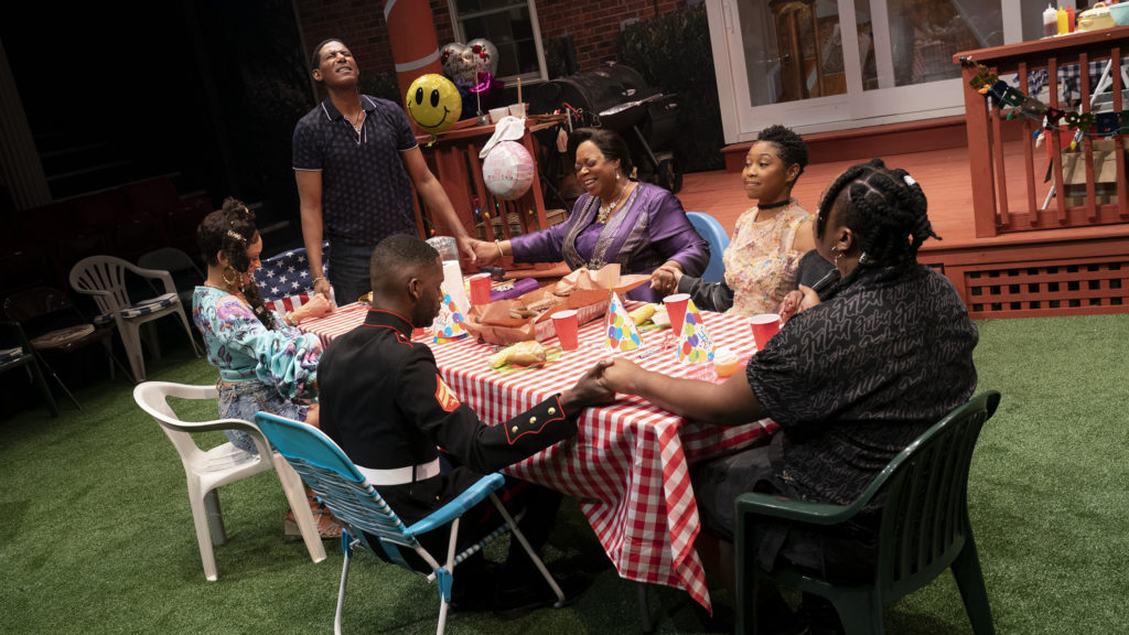 In this version, Juicy – the play’s stand-in for the Danish Prince – is a black gay college student who seems destined to crumble under the weight of his difficult circumstances. Although the piece uses Shakespeare’s play as its inspiration, Mr. Ijames slyly has his own agenda. Indeed, instead of using the Shakespeare play as a metaphor for the systemic tragedy that befalls many of those who identify as both Black and Queer, Fat Ham exuberantly breaks free of the chains of both societal and theatrical expectations. As such, the work refuses to track a parallel trajectory of Hamlet, instead choosing to invert it and move beyond Shakespeare to chart its own triumphant path. Which is not to say that the play unrecognizably alters the Bard’s pay. In fact, the playwright uses swaths of Shakespeare’s text (often times verbatim) to serve the specificity of his own tale. Coincidentally, Mr. Ijames covers the same thematic territory another recent Pulitzer Prize-winning work, this year’s odds-on favorite for the Tony Award for Best Musical A Strange Loop.