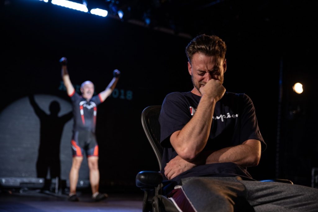 In the central role of Man, David Gould is a marvel of control and physicality (he pulls off Katie Rose McLaughlin’s organically-placed choreography with rugged force). Indeed, he brilliantly captures the simultaneous confidence and cluelessness that often manifests itself in masculine behavior, especially in the world of professional hockey, that most unrelentingly macho of sports organizations. And by allowing us to get a harrowing glimpse of the fragile vulnerability that lurks behind the exterior, Mr. Gould manages to create a fully formed portrayal, despite the script’s intentional vagueness. Mr. Gould is joined onstage by distinctive supporting turns from Dick Toth as Other Man and young Aksel Latham-Mitchell as hockey player John Tavares, the play’s only specified character.