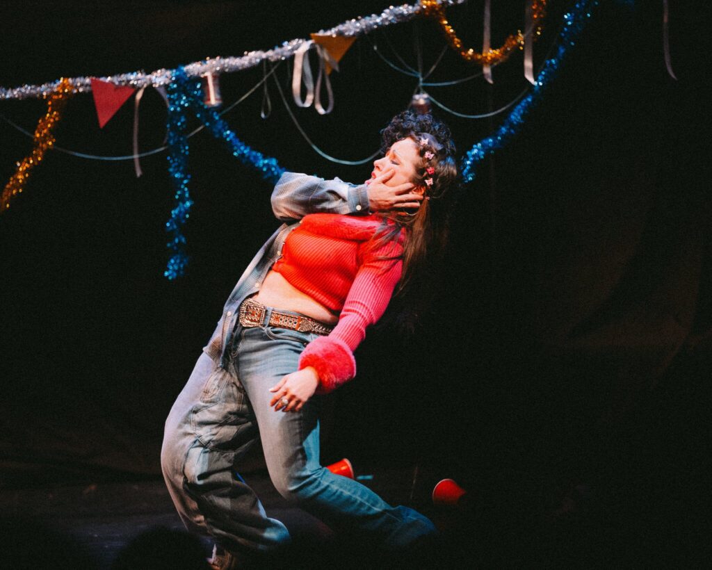 Weer arrives in New York on a wave of anticipation — the current run at Cherry Lane is all but sold out — and happily, the show meets expectations, wreaking havoc every step of the way. Building on clowning and performance art traditions, Palamides’ show harkens back to the kind of daredevil performances that was once a trademark of downtown theater. Set during the 1990s, the piece chronicles the turbulent romance between Mark and Christina, which culminates in break-up fight for the ages on the eve of the new millennium. In essence, the play is a ball of gratuitous sex, violence, and absurdity. The gimmick here is that both characters are played by Palamides, who is garbed in a clever costume that literally splits her into the two characters (kudos to costume designer Ashley Dudek’s witty work).