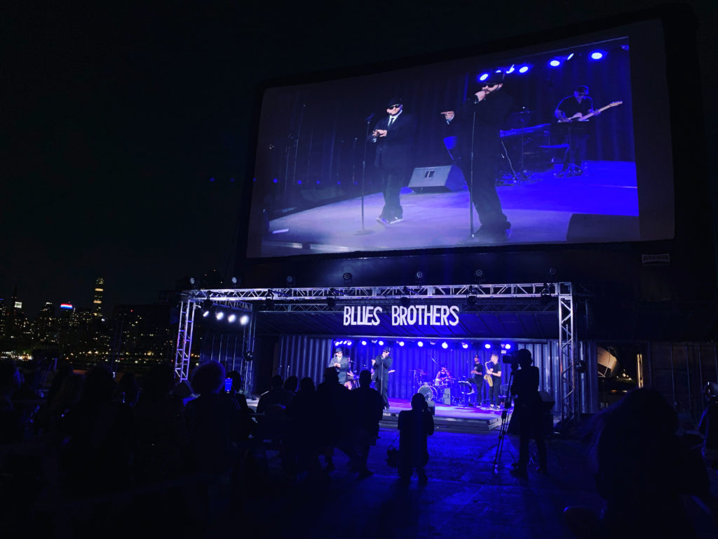 Last night, I made the trek all the way out to a remote nook of Astoria to attend the opening night performance of Radial Park’s festive production/screening of The Blues Brothers. Mashing the drive-in movie experience with outdoor live concert and theatrical elements, Radial Park’s unique concoctions has made it one of the very few venues in New York to have been able to safely present live performance during the pandemic. Recent hybrid screenings have included Andrew Lloyd Webber’s The Phantom of the Opera and Prince’s Purple Rain, both of which I unfortunately missed and had been curious about. The current presentation of the 1980s cult classic film The Blues Brothers marks my first Radial Park experience — and, in short, it was a blast.