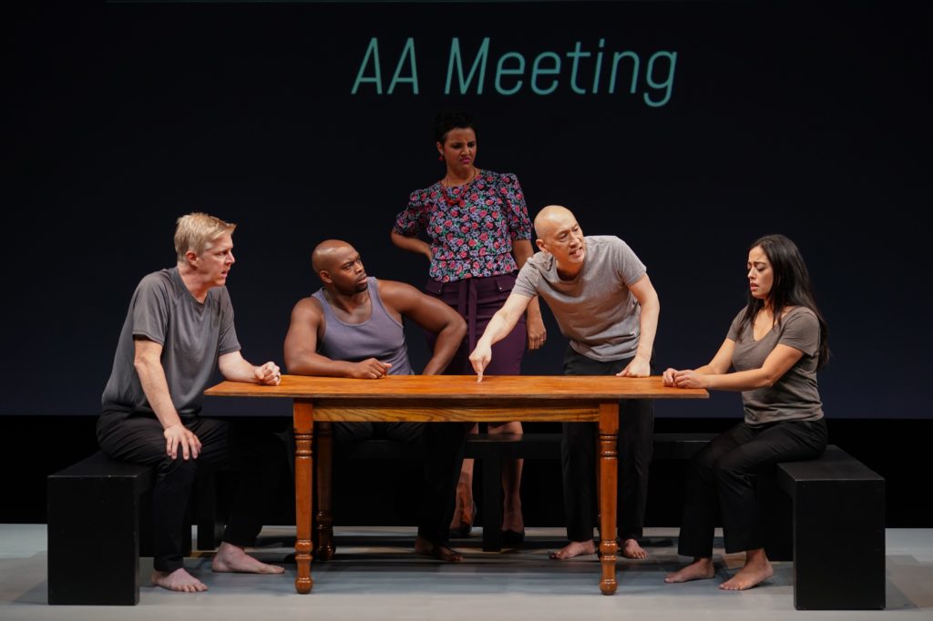 Originally written to be performed as a solo show, Ms. Smith has, for Signature’s current production, re-conceived and heavily revised the piece for an ensemble cast of five. As a result, Ms. Smith re-directs the audience’s focus from the spectacular achievement of her own chameleonic performance to the real matter at hand – the slippery topic of racial justice in America. As before, the difficult issue continues to be manifested by the “Rashomon”-like quality of the interviews, which invariably (and with great discipline) sympathize with the respective interviewee’s point of view. By having an additional four bodies onstage, Ms. Smiths has been given the opportunity to expand the theatrical scope of her work, which she takes advantage of (e.g., just witness the ensemble work in “A Dinner Party That Never Happened” and “AA Meeting”).