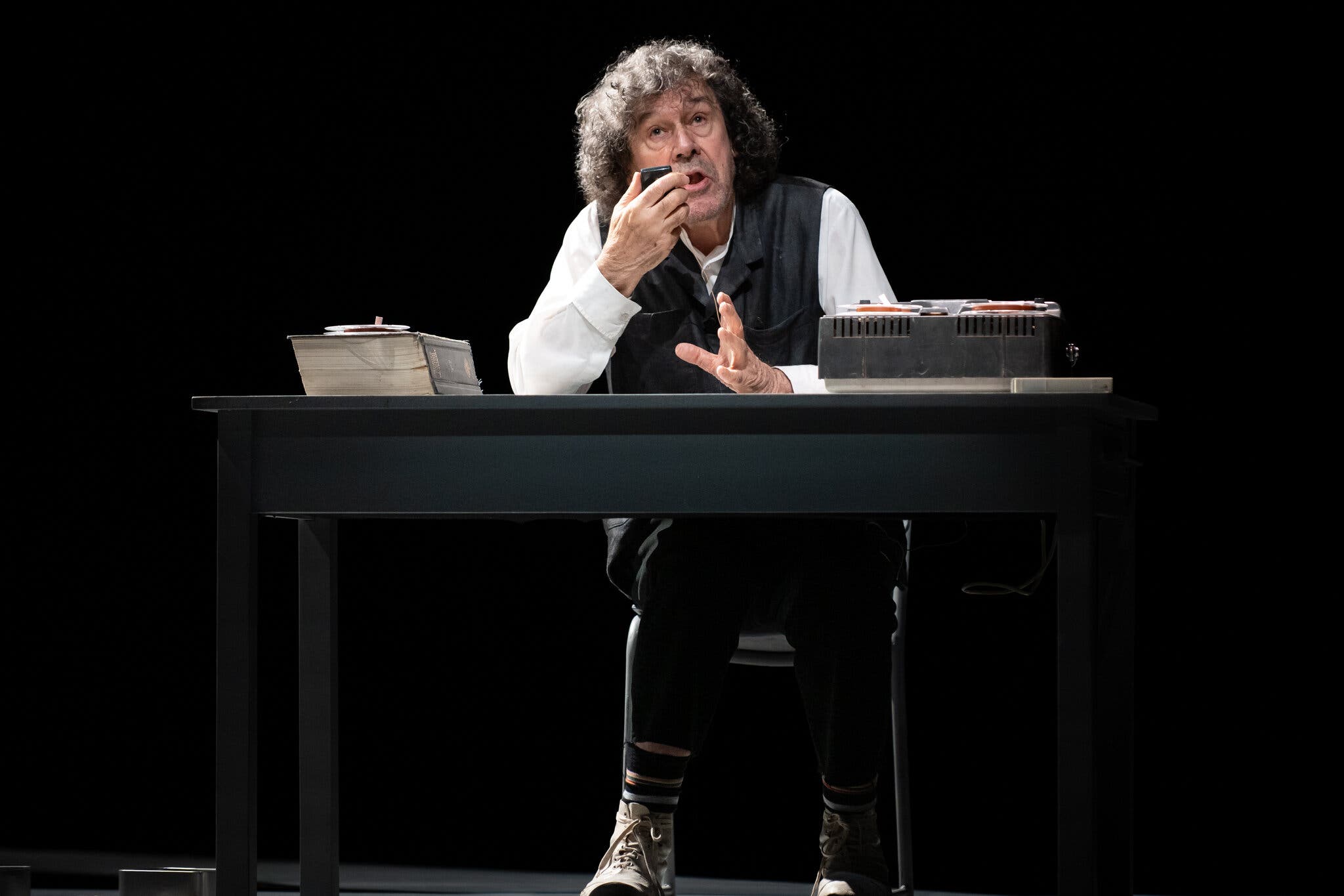 Vicky Featherstone’s meticulous production — a haunting apparition that emerges from the darkness and returns to it — draws you in with its minimalism and sublime attention to detail. Just as carefully calibrated is Rea’s rigorous, magnetic performance — his use of silence, sense of timing, and subtle physicality are masterful — of a man caught between the deadening void of the present (and the future) and the ghostly remembrances of the past and his past self. What makes the actor’s turn so brilliant is how transparently he conveys being on the fence as to whether his three-decades-younger self disgusts him or enthralls him. There’s also a thread of neglected regret that runs through his performance, and it’s quietly devastating to witness.
