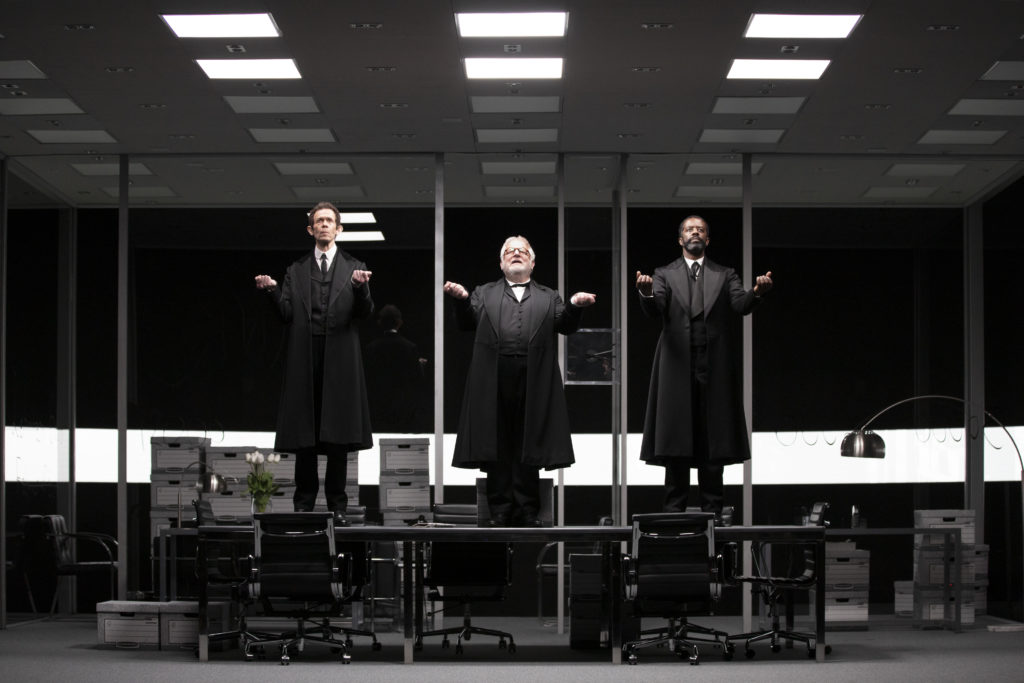 The play’s trump card is the show’s three actors – Simon Russell Beale, Adam Godley, and Adrian Lester (who replaces Ben Miles of previous mountings of the production) – whose vivid performances are collectively a master class in impeccable acting technique and sheer stamina. Although most of the story is told in the third person, the trio is able to bring astonishing specificity and vitality to each of the constellation of characters they are tasked to portray. Each also brings their own unique brand of actorly brilliance to the mix – Mr. Beale’s Shakespearean heft, Mr. Godley’s terrific physicality, Mr. Lester’s commanding physical presence – which makes the experience even richer. Although a part of me misses the epic sweep of The Lehman Trilogy when it played the expansive Park Avenue Armory, Sam Mendes’s magnificently fluid production (kudos to Es Devlin’s clever rotating office set and Nick Powell’s cinematic musical underscoring) nevertheless completely captivates at the more intimate Nederlander.