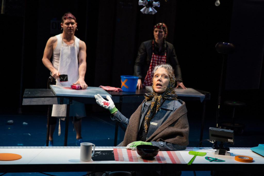 Kate Valk (front), Ari Fliakos, and Erin Mullin in The Wooster Group’s production of Bertolt Brecht’s “The Mother” at The Performing Garage.