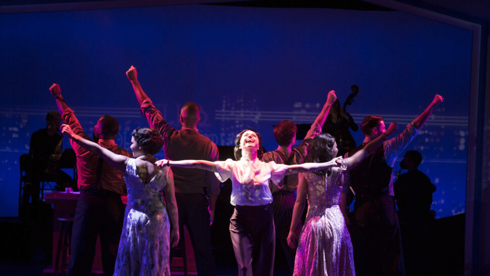 In form, the show sits firmly between a revue and a musical. If anything, the production calls to mind Movin’ Out, Twyla Tharp’s 2002 “dansical” that used the Billy Joel songbook to tell the story of a group of friends from youthful friendships and loves, to wartime strife, to mature adulthood. Similarly, Hoagy Carmichael’s Stardust Road pretty much uses the same narrative arc (merely swapping the Vietnam War with World War II) — suggestive as it may be — even including a good dose of exuberant dance numbers (courtesy of choreographer Michael Lichtefeld).