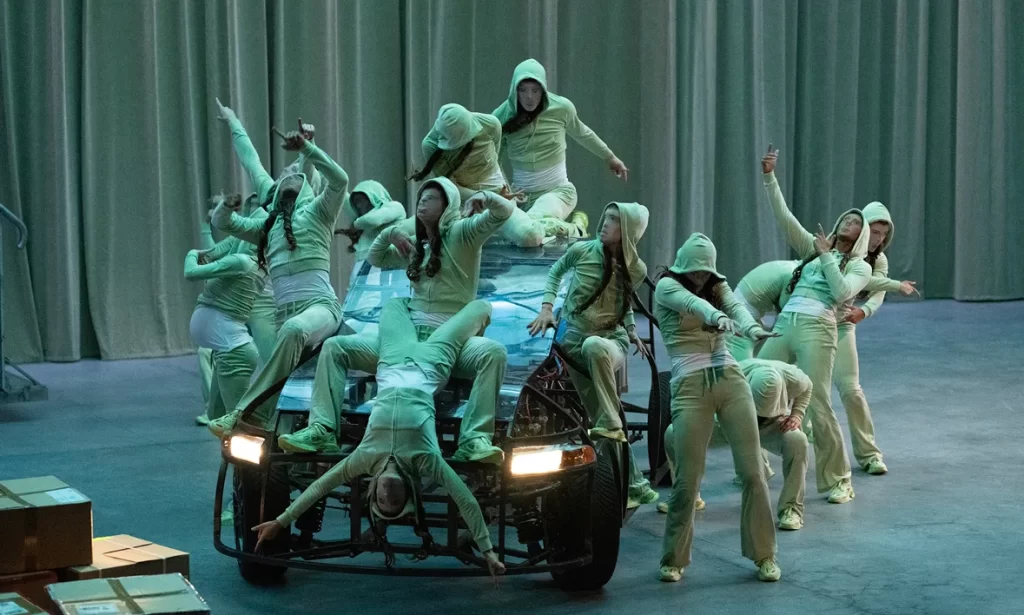 Then over at the Brooklyn Academy of Music’s BAM Howard Gilman Opera House, Dance Reflections continued with The Age of Content (HIGHLY RECOMMENDED), (LA)HORDE (i.e., the creative collective of Marine Brutti, Jonathan Debrouwer, and Arthur Harel) and Ballet national de Marseille’s latest large scale choreographic installation, this one contemplating the human body in an existence consumed by the digital world — more specifically, video games, avatars, artificial intelligence, even porn. What differentiates the works produced by this collaboration — and what makes them so stimulating and thrilling to watch — is that they aren’t afraid of addressing and/or conveying more complex and pressing ideas that are front of mind for many of us in these unsettled and unsettling current times. And like their production of Room with a View (which New Yorker’s were exposed to during last year’s festival; you can read my review of that piece here), The Age of Content is audacious and thrillingly realized on a massive scale. Indeed, truth be told, this is what true singularity of vision and a big budget can get you. (LA)HORDE’s staging is a masterful hybrid at the intersection of dance/movement, design, and theatrical concept. Over the course of 75 minutes, the full-length work ingeniously mashes a number of disparate vernaculars and aesthetics to contemplate the evolving fabric of human existence vis-à-vis technology. By combining the visceral immediacy of live performance (kudos to the spectacularly game company of dancers), the internal logic of video gaming (particularly referenced is Grand Theft Auto, complete with a near life-sized motorized car onstage), the uninhibitedness of porn, and the fabricated ebullience of TikTok dances, Age of Content conjures a vision of a fractured reality where juxtapositions are the norm. Fear not, it’s actually all less depressing than revealing.