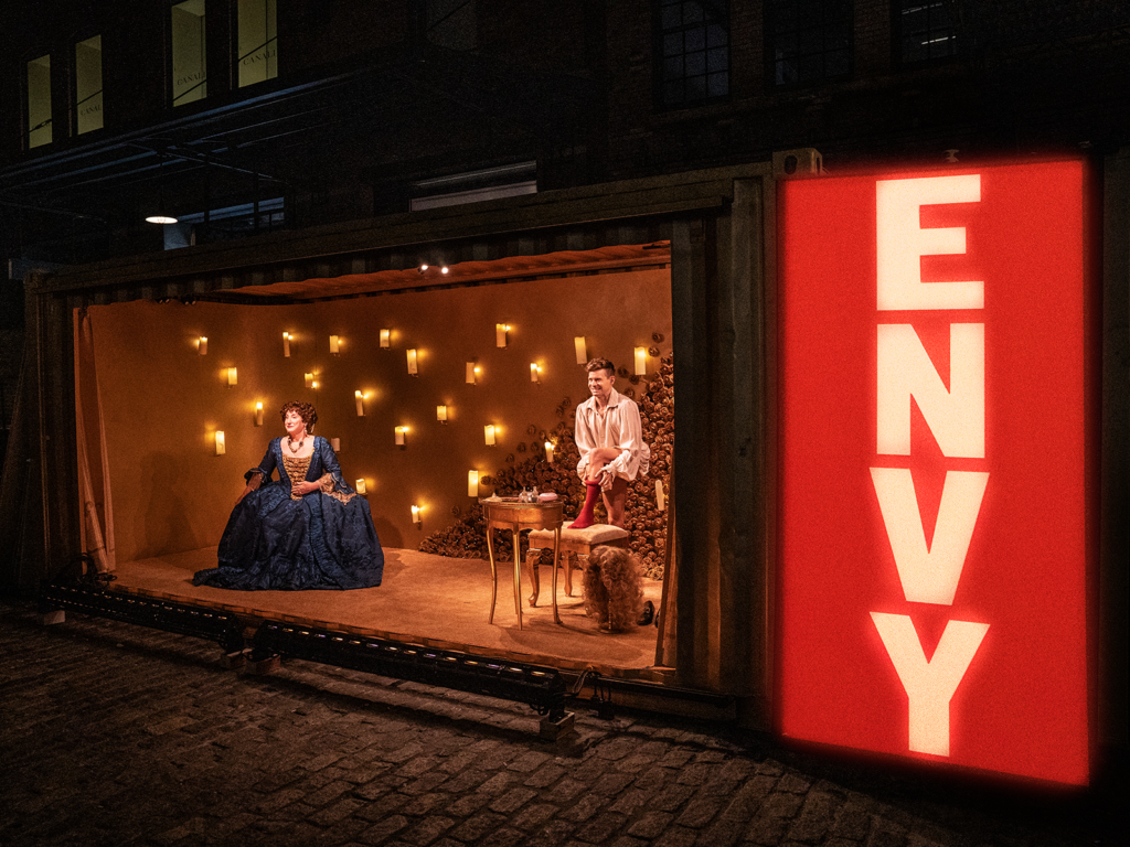 Then we have Seven Deadly Sins, (RECOMMENDED) an outdoor production which utilizes the Meatpacking District’s unused commercial storefronts as mini-stages from which to depict pride, greed, lust, gluttony, envy, anger, and sloth. Like The Watering Hole, the show is made up of a series of short plays written by talents likes of Bess Wohl, Moisés Kaufman, Thomas Bradshaw, Ming Pieffer, among others. These punchy, incisively acted works – which put the seven sins within the context of contemporary life – are tangy bite-sized nuggets that often conclude with unexpected twists. Logistically, the audience is synchronized to move from storefront to storefront and experiences these micro-plays with the aid of silent disco headphones (to funnel in the plays’ dialogue). Although this may sound overly fussy, it’s all orchestrated seamlessly, resulting in a fascinating, immersive experience akin to watching museum dioramas come to life. Overall, Seven Deadly Sins is a seductive, sexy success, which is in no small part also due to to the production’s bold, vividly-realized design elements.