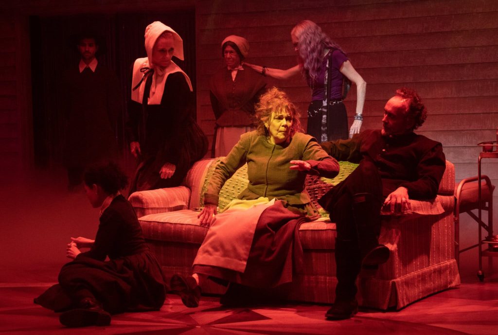 First up at the Mitzi E. Newhouse Theater is Sarah Ruhl’s Becky Nurse of Salem (RECOMMENDED). Ms. Ruhl is not one to shy away from fantastical flights of fancy, and her latest work – which tells the turbulent story of Becky Nurse, an opioid-addicted middle-aged descendant of one of the women notoriously accused of during the Salem Witch Trials – most certainly fits the same mold. Feisty Tony-winner Deirdre O’Connell portrays Becky Nurse with the the same kind of uncompromising commitment that has made her a favorite amongst more experimental theater-makers (she won the coveted Tony for her meticulous lip-syncing work in the title role of Lucas Hnath’s Dana H.). The actress does her best to bring shape and urgency to Ms. Ruhl’s quirky but unruly play, especially in the play’s hallucinatory second act, during which Becky finds herself jailed for breaking and entering a Salem Witch Trials museum (where she was a former employee) and drug possession. As she struggles through severe withdrawal symptoms, she falls in and out of consciousness, half envisioning herself accused of witchcraft in imagined courtroom scenes set in 1692. As she battles her demons, she painfully reclaims her story from the clutches of her traumatic family legacy and years of drug abuse.