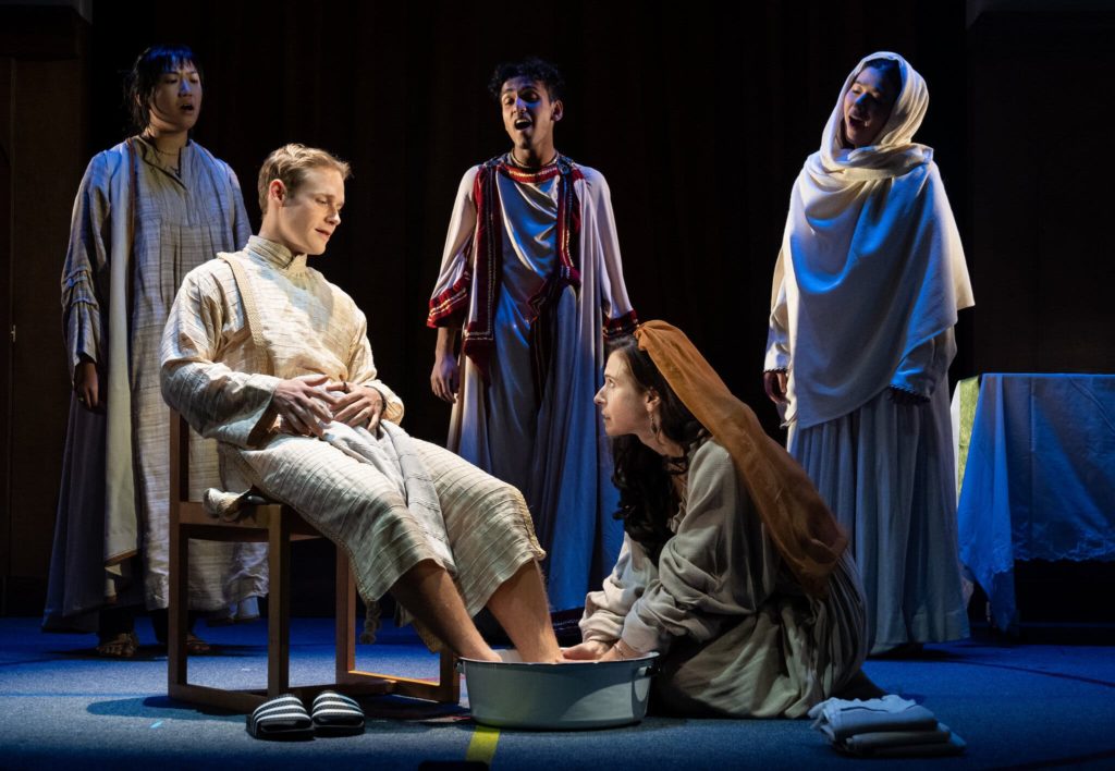 No less messy yet fascinating is another Lincoln Center Theater production, Julia May Jonas’s new play Your Own Personal Exegesis (RECOMMENDED), which is playing a few floors above the Mitzi E. Newhouse at the rooftop level Claire Tow Theater. Set largely at a progressive church in New Jersey, the new play tells the story of a high school Christian youth group, wherein teenagers navigate their raging hormones and respective personal issues at home. There’s much to commend about the Ms. Jonas’s adventurous play, from its unorthodox structure (which his modeled after a church service), to its occasional passages of ecstatic and exciting playwriting that intermingle the sacred, profane, and mundane. That being said, the play also has a tendency to go off in the proverbial ledge (e.g., one of the high schoolers gradually turns into a bird for no apparent reason), resulting in a few scenes that register more as bizarre rather than thought-provoking. That being said, the well-appointed LCT3 production (designed by Brett J. Banakis) is beautifully directed by Annie Tippe, who gives the work an appropriately surreal bent. The young cast is convincing in their portrayals of developing young adults, in all their insecurities and unfiltered emotions. As the youth group leader, the reliable Hannah Cabell gives a slippery performance – at once menacing and wholesome – that got under my skin.