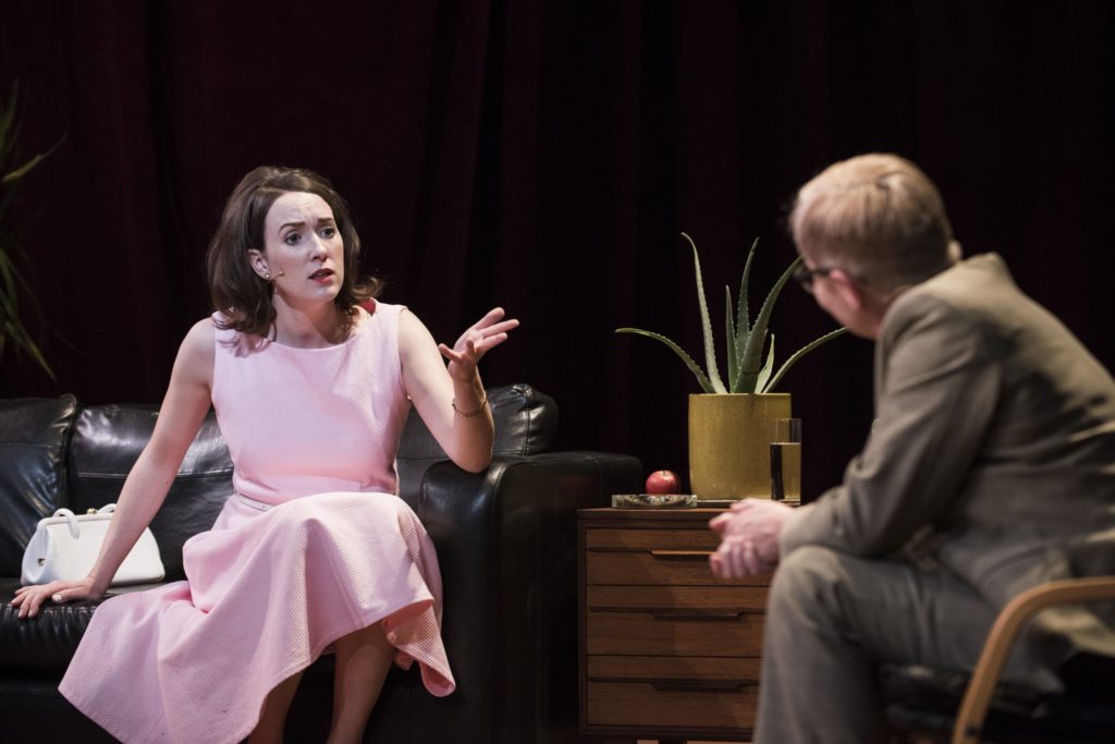 Last night, Pan Pan’s production of The Patient Gloria (SOMEWHAT RECOMMENDED) opened at St. Ann’s Warehouse in Brooklyn. The work was previously seen at the Edinburgh Fringe Festival, where it created buzz and garnered acclaim. In essence, the piece is a deconstruction of three filmed psychoanalysis sessions that were released to the public at large without the consent of its subject, Gloria Szymanski. Using material from the underlying 1965 film as well biting additional commentary by Moxley — who stars not only as herself, but also as the three white male psychotherapists who conducted the sessions — the work is an unruly, punk rock retaliation not only against the egregious wrongs done against Ms. Szymanski, but also — more broadly — to the practice of psychotherapy and all things patriarchal. Unfortunately, as a piece of feminist-cum-experimental theater, the work feels a tad stale, registering more like a relic from decades past instead of a piece of truly radical contemporary theater. Nevertheless, the performances from Moxley and Liv O’Donoghue — who dutifully takes on the titular role — are admirably and fiercely committed.